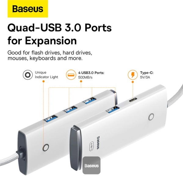ظریف سفید و کابل یک‌متری، چهار پورت USB 3.0 پرسرعت را در اختیار کاربر قرار می‌دهد تا اتصال هم‌زمان چندین وسیله جانبی بدون افت سرعت
