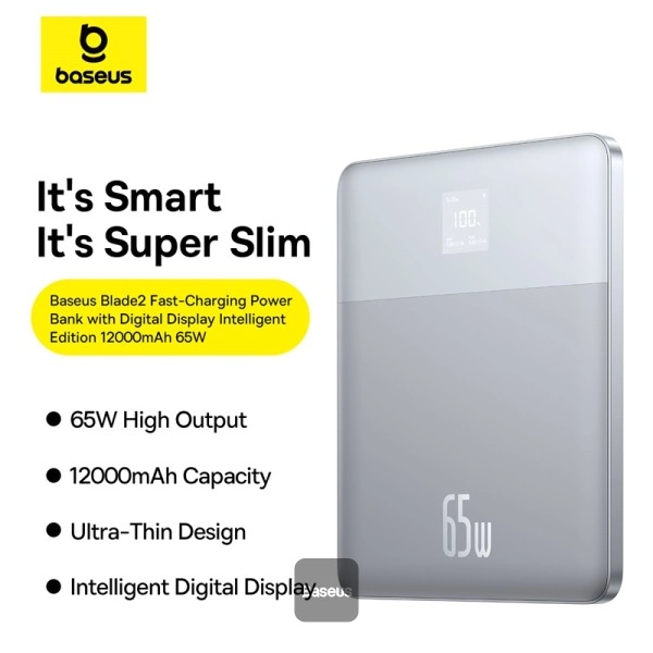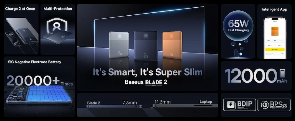 پاوربانک Baseus Blade 2 12000mAh 65W دارای بدنهای به ضخامت ۷.۳ میلیمتر و ساختار فشرده برای همراهی با اولترابوک ها، لپتاپ ها و دستگاه های