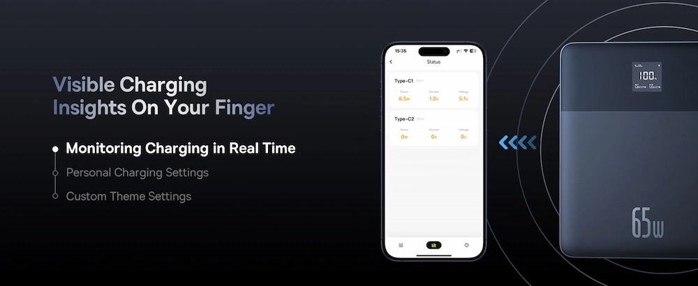 این مدل از فناوری فست شارژ ۶۵ وات، دو پورت Type‑C و نمایشگر دیجیتال هوشمند برای نمایش لحظهای توان و وضعیت شارژ استفاده میکند. ساختار امن