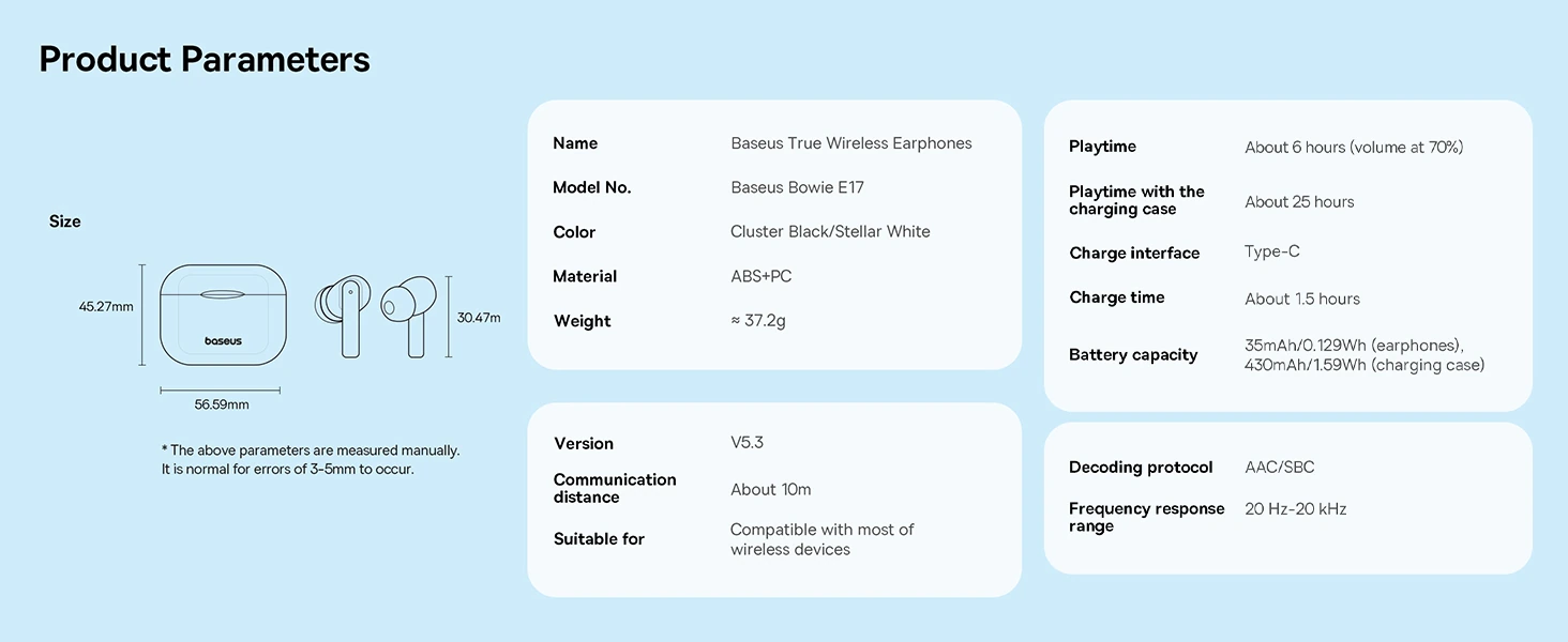 هندزفری Baseus Bowie E17 با متریال ABS و PC ساخته شده است و