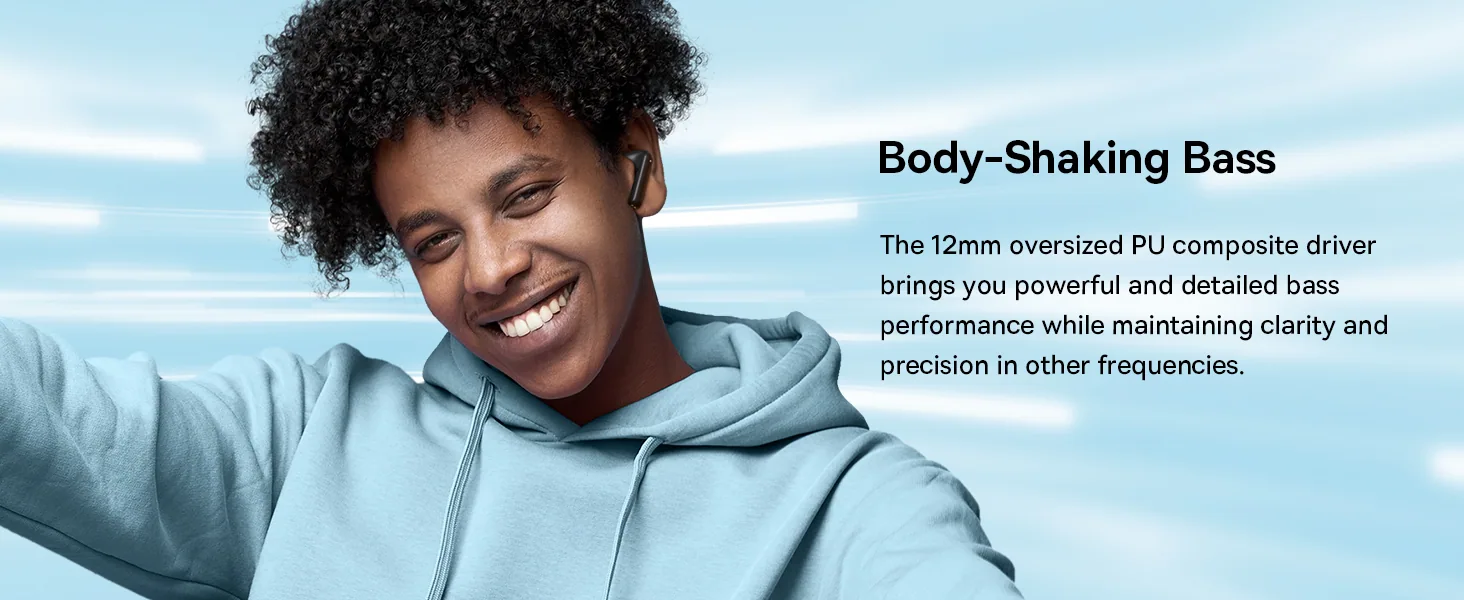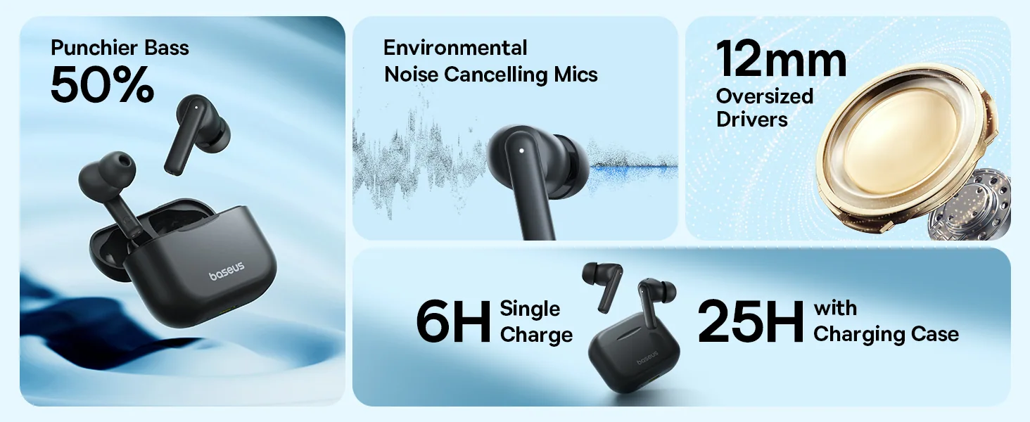 هندزفری بیسیم Baseus Bowie E17 با درایور بزرگ 12 میلیمتری، بلوتوث 5.3، میکروفون دوگانه ENC و شارژدهی 25 ساعته طراحی شده است.