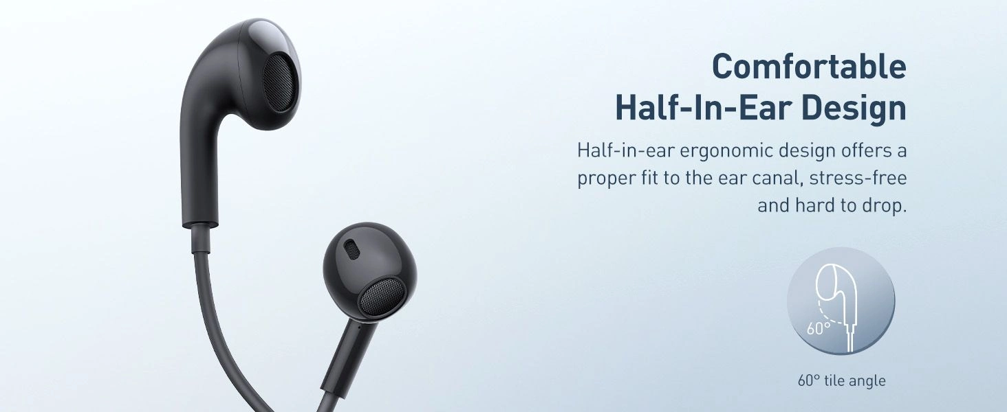 هندزفری سیمی Baseus Encok CZ17 با طراحی نیمهگوشی و درایور 14 میلیمتری، صدا را از طریق چیپ DAC داخلی با شفافیت بیشتری منتقل
