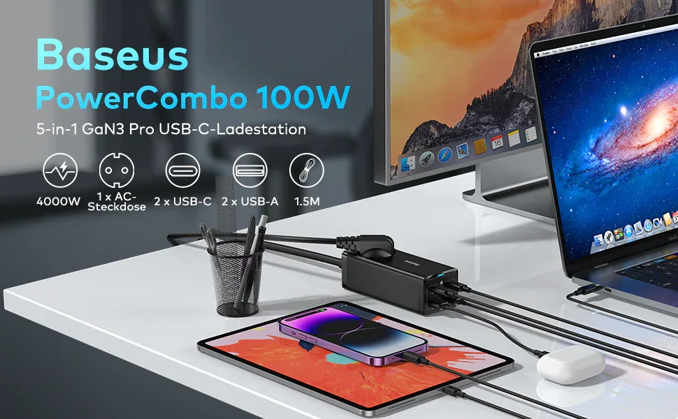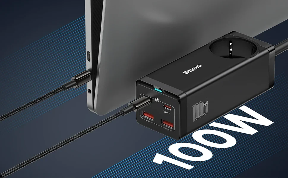 پاوراستریپ رومیزی Baseus GaN3 Pro با خروجی ترکیبی AC + دو پورت USB‑C و دو پورت USB‑A، حداکثر توان 100 وات را ارائه میدهد و امکان شارژ