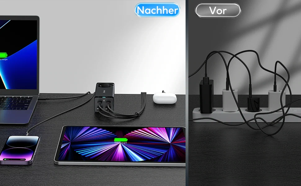 این پاوراستریپ با ترکیب یک پریز AC و چهار پورت شارژ، نیاز به چند آداپتور