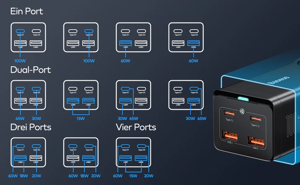 | خروجی چهار پورت | C1 + C2 + (USB1 + USB2): 60W + 20W + 15W |