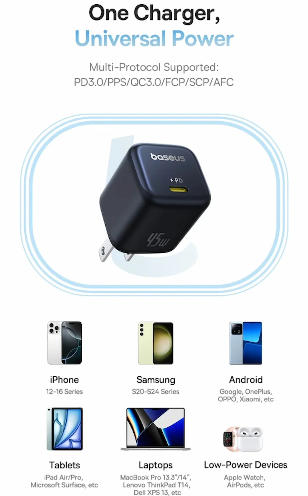 | سازگاری | iPhone 12–16، Samsung S20–S24، Pixel، iPad، MacBook سبک، دستگاههای کممصرف |