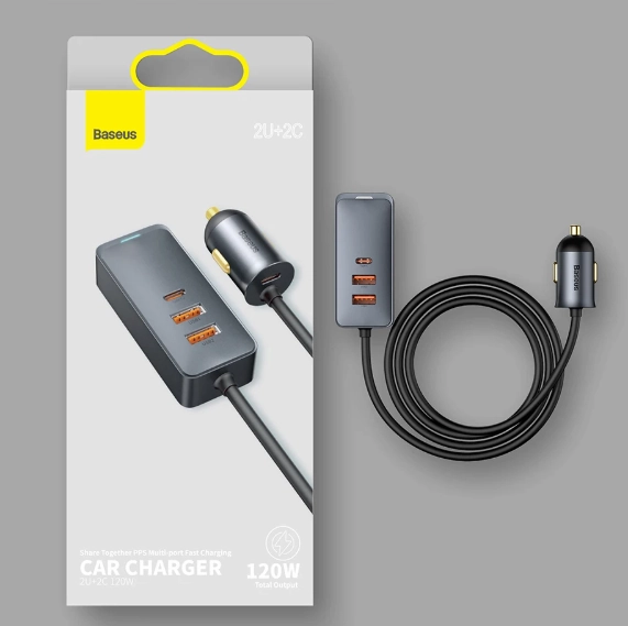 این مدل با چهار پورت سریع (دو USB و دو Type‑C) و کابل افزایندهی ۱.۵ متری برای صندلی عقب، راهحل کامل برای خانوادهها و مسافران خودرو است.