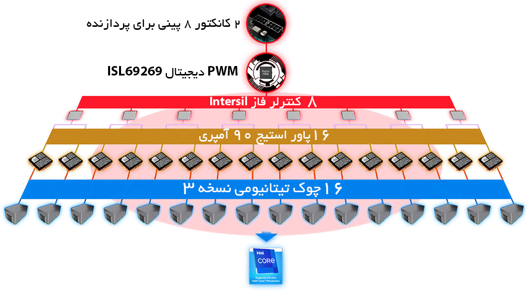طراحی دیجیتال مدار تغذیه، برق رسانی به CPU را سریع و آسان کرده و باعث ایجاد شرایط مناسب جهت اورکلاک پردازنده میشود.