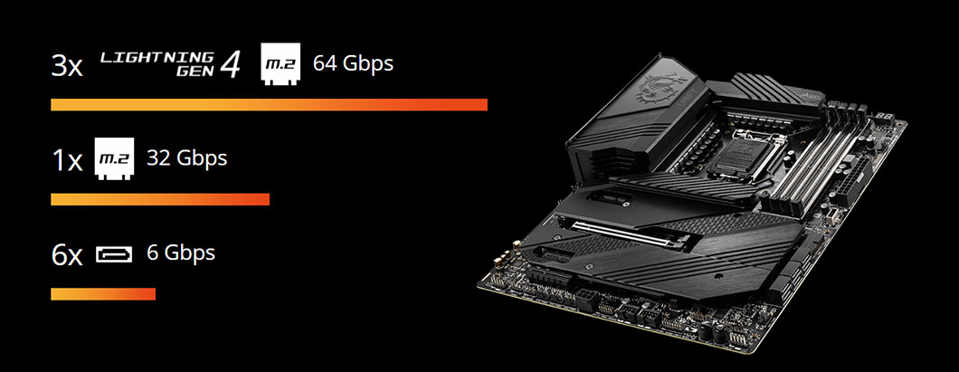 مادربردهای MSI B560 با استفاده از نسل یازدهم پردازندههای اینتل، از آخرین نسخه فناوری Lightning یعنی GEN 4 پشتیبانی میکنند که سریعترین سرعت را در بین حافظههای M.2 در اختیار کاربر قرار میدهد. تا 64 گیگابایت بر ثانیه!