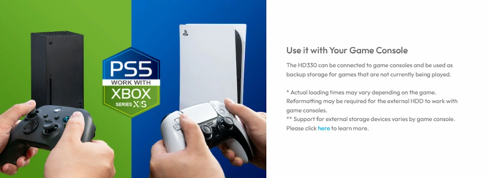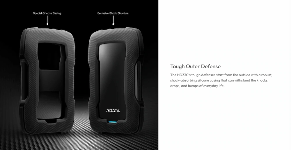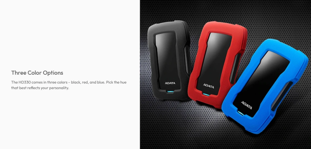 مدل HD330 با بدنهای از پلاستیک مستحکم و لایه محافظ سیلیکونی ضدشوک، برای استفاده روزمره و قابلحمل طراحی شده است. این محافظ انعطافپذیر، در برابر سقوط، ضربه، خطوخش و فشار معمولی کاملاً مقاوم است و از هستهی داخلی هارد محافظت میکند. ابعاد 132.7 × 88.9 × 16.2 میلیمتر و وزن حدود 190 گرم، باعث میشود HD330 بهراحتی در کیف لپتاپ جا گرفته و قابلحمل باشد. این مدل در سه رنگ مشکی، قرمز و آبی عرضه میشود.