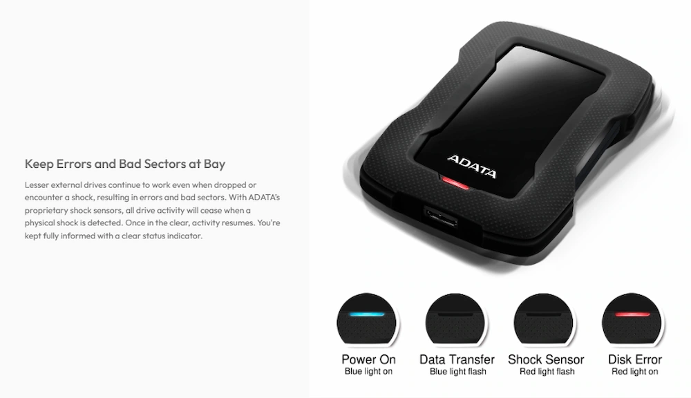 ویژگی منحصربهفرد حسگر ضدشوک (Shock Sensor) در صورت تشخیص لرزش یا ضربه، عملیات انتقال داده را متوقف میکند تا از ایجاد خطا یا بدسکتور جلوگیری شود. پس از بازگشت به وضعیت پایدار، عملکرد هارد از سر گرفته میشود. نشانگر LED در پایین لوگوی ADATA وضعیت دستگاه را در حالتهای آمادهبهکار، در حال انتقال، و هنگام واردشدن شوک فیزیکی (با رنگهای آبی و قرمز) نمایش میدهد.