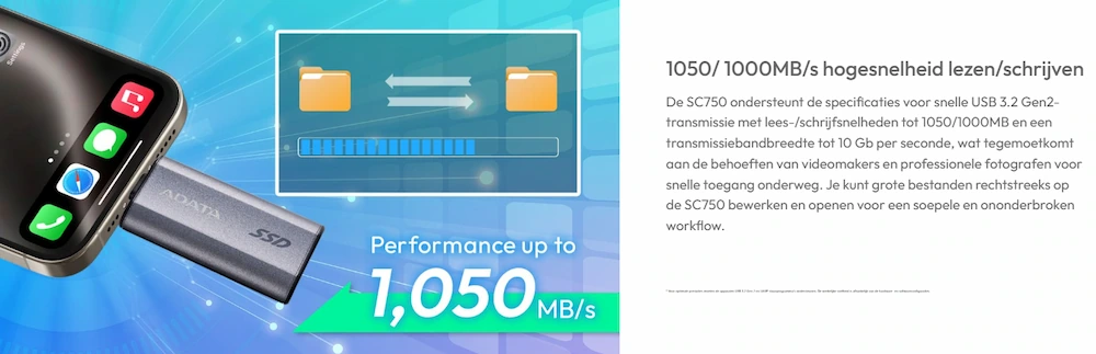 ADATA SC750 External SSD با رابط USB 3.2 Gen2 Type‑C سرعت خواندن و نوشتن متوالی تا 1050 MB/s و 1000 MB/s ارائه میدهد. طراحی جمعوجور و بدون نیاز به کابل این مدل، آن را به گزینهای مناسب برای ذخیره و انتقال سریع داده در تلفنهای همراه، تبلتها و سیستمهای رایانهای تبدیل کرده است.این درایو در ظرفیتهای 500 GB، 1 TB و 2 TB عرضه میشود.