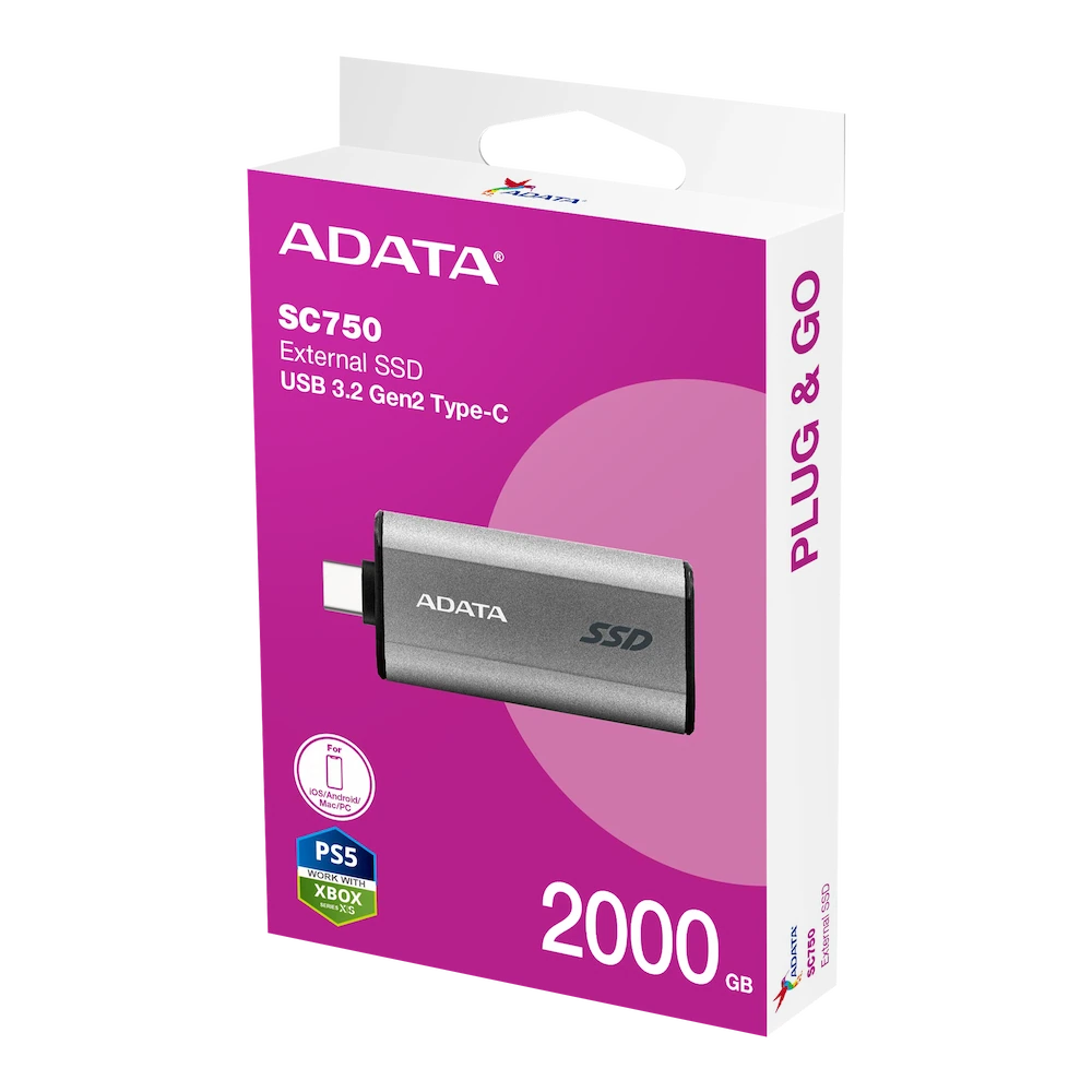 ADATA SC750 External SSD با رابط USB 3.2 Gen2 Type‑C سرعت خواندن و نوشتن متوالی تا 1050 MB/s و 1000 MB/s ارائه میدهد. طراحی جمعوجور و بدون نیاز به کابل این مدل، آن را به گزینهای مناسب برای ذخیره و انتقال سریع داده در تلفنهای همراه، تبلتها و سیستمهای رایانهای تبدیل کرده است.این درایو در ظرفیتهای 500 GB، 1 TB و 2 TB عرضه میشود.