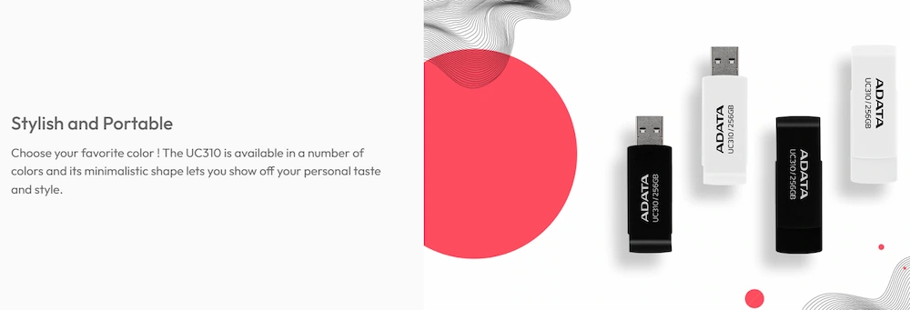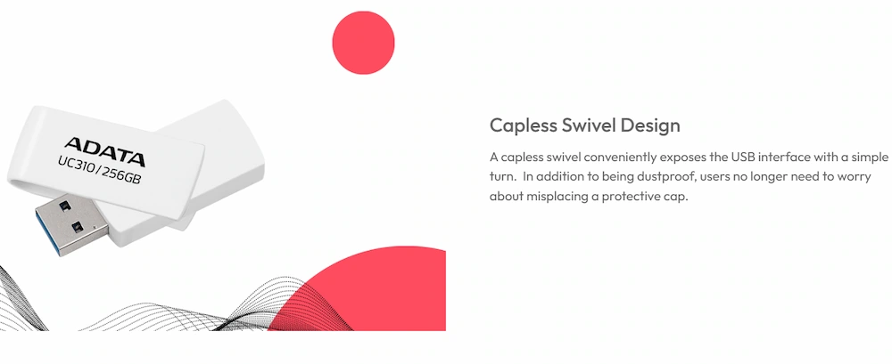 فلش UC310 با بدنهای از پلاستیک فشرده و دوامبالا ساخته شده است. طراحی چرخشی بدون درپوش (Capless Swivel) باعث میشود پوشش پورت USB بهسادگی و با یک چرخش باز یا بسته شود، بدون آنکه کاربر نگران گمکردن درپوش باشد. ابعاد 58 × 20 × 13 میلیمتر و وزن 9 گرم آن، حمل و استفاده را بسیار آسان کرده است. در چند رنگ متنوع عرضه میشود تا با سلیقههای مختلف سازگار باشد.