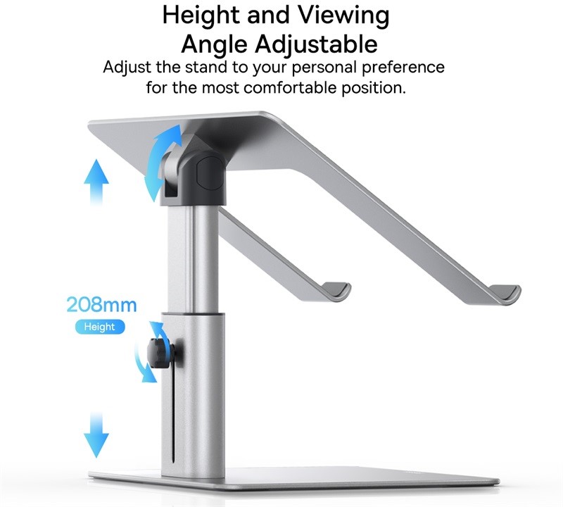 این پایه با قابلیت تنظیم ارتفاع بین ۷۰ تا ۲۸۰ میلیمتر و زاویه بین ۲۰ تا ۱۶۰ درجه، امکان تنظیم موقعیت نمایشگر لپتاپ متناسب با سطح چشم کاربر را فراهم میسازد. این ویژگی باعث کاهش فشار وارده به گردن، شانه و ستون فقرات در استفادههای طولانیمدت میشود و نقش بسزایی در بهبود وضعیت نشستن ایفا میکند.