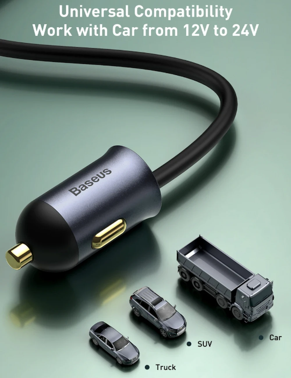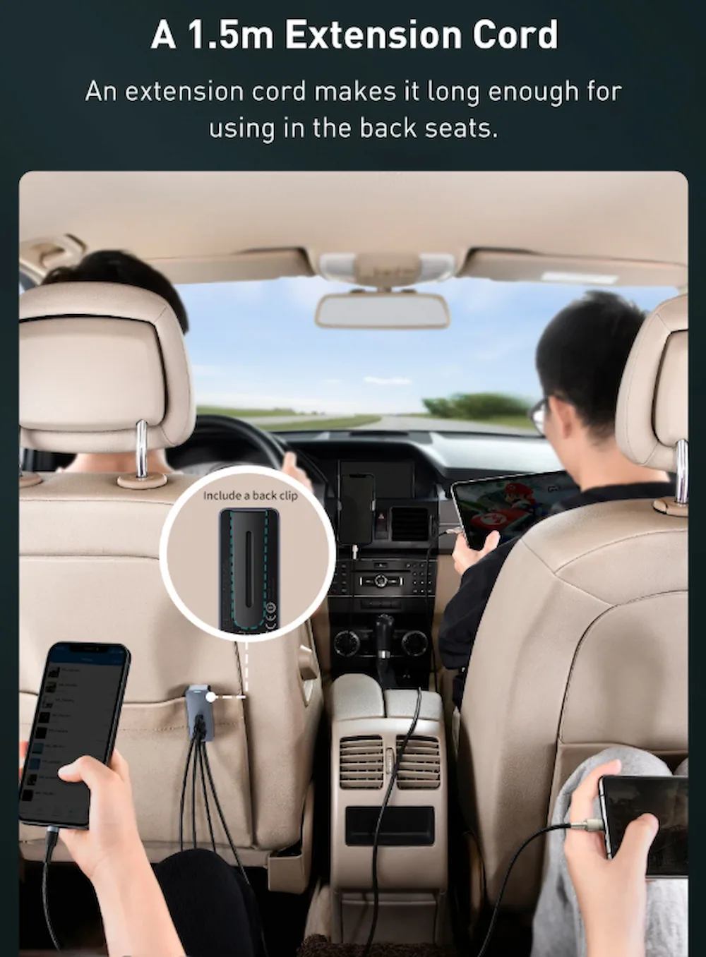 این مدل با چهار پورت سریع (دو USB و دو Type‑C) و کابل افزایندهی ۱.۵ متری برای صندلی عقب، راهحل کامل برای خانوادهها و مسافران خودرو است.