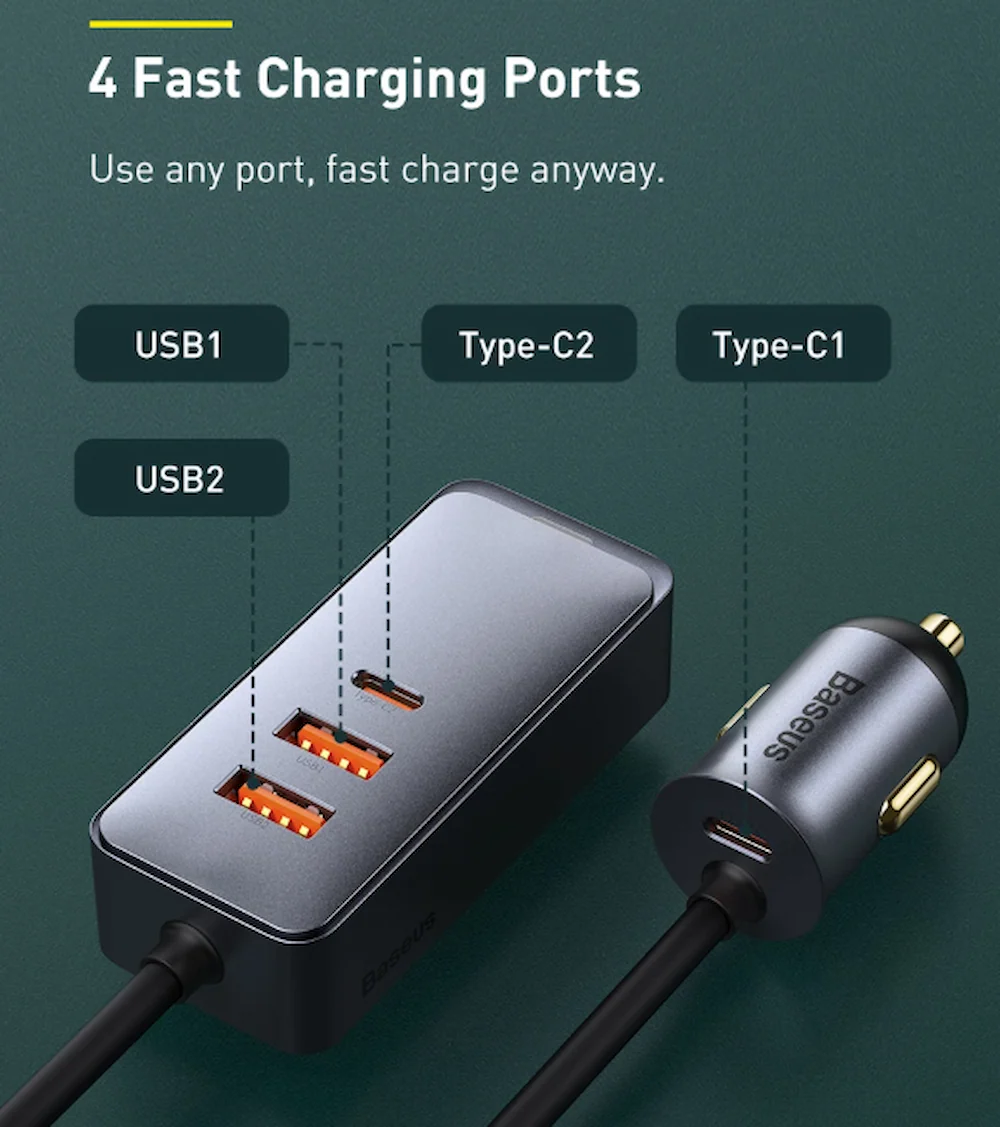 دو پورت USB و دو پورت Type‑C. همچنین کابل توسعهی ۱.۵ متر اجازه میدهد سرنشینان