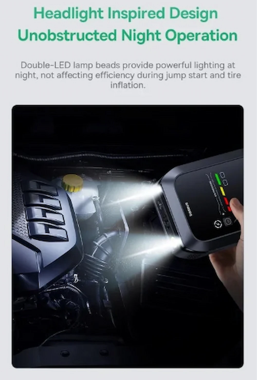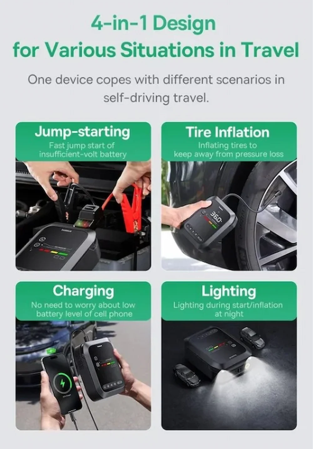 • طراحی چهارکاره (راه‌انداز باتری، پمپ باد، پاوربانک، نور اضطراری)