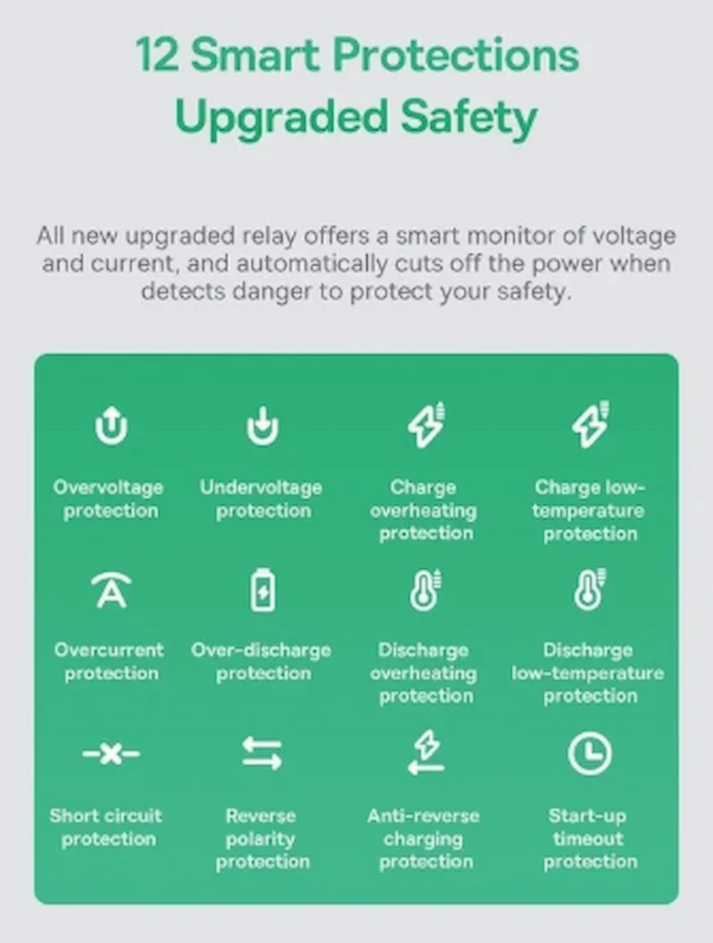 (Overcurrent، Overvoltage، Overheat، Reverse Polarity، Overcharge، و شوک