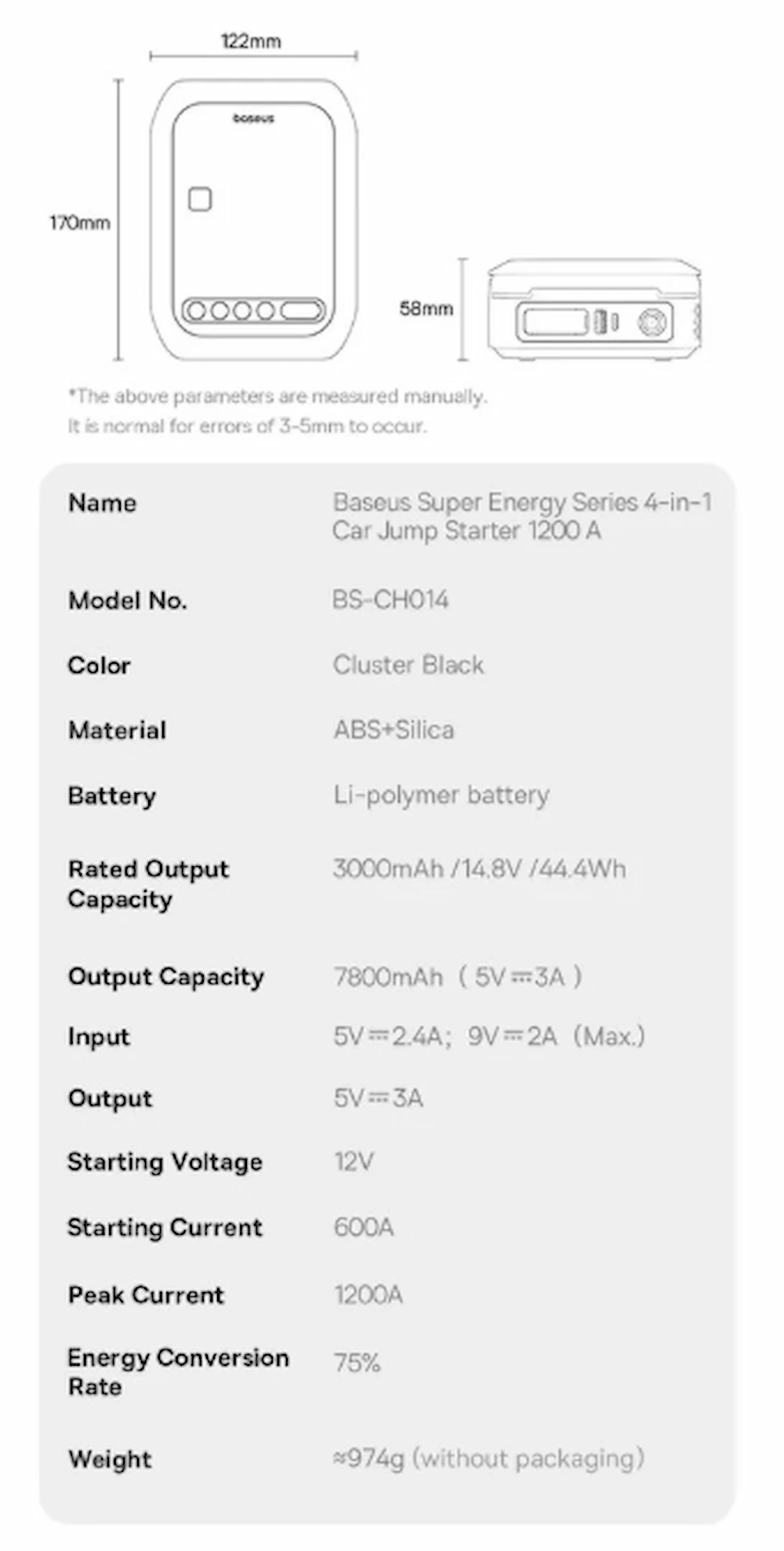 مستطیلی 170 × 122 × 58 میلی‌متر، ترکیبی از جنس مقاوم ABS و سیلیکا را در