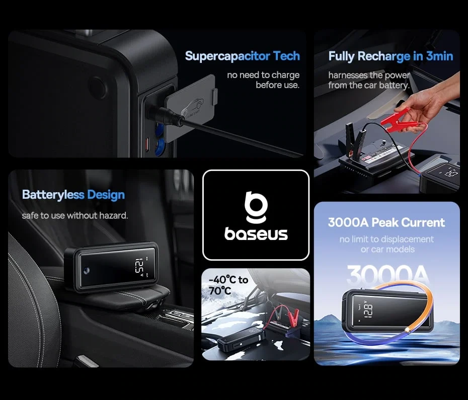 راهانداز باتری Baseus مدل Super Energy Mega 3000A نسل جدید استارترهای هوشمند با فناوری ابرخازنی (Supercapacitor) است که بدون استفاده از