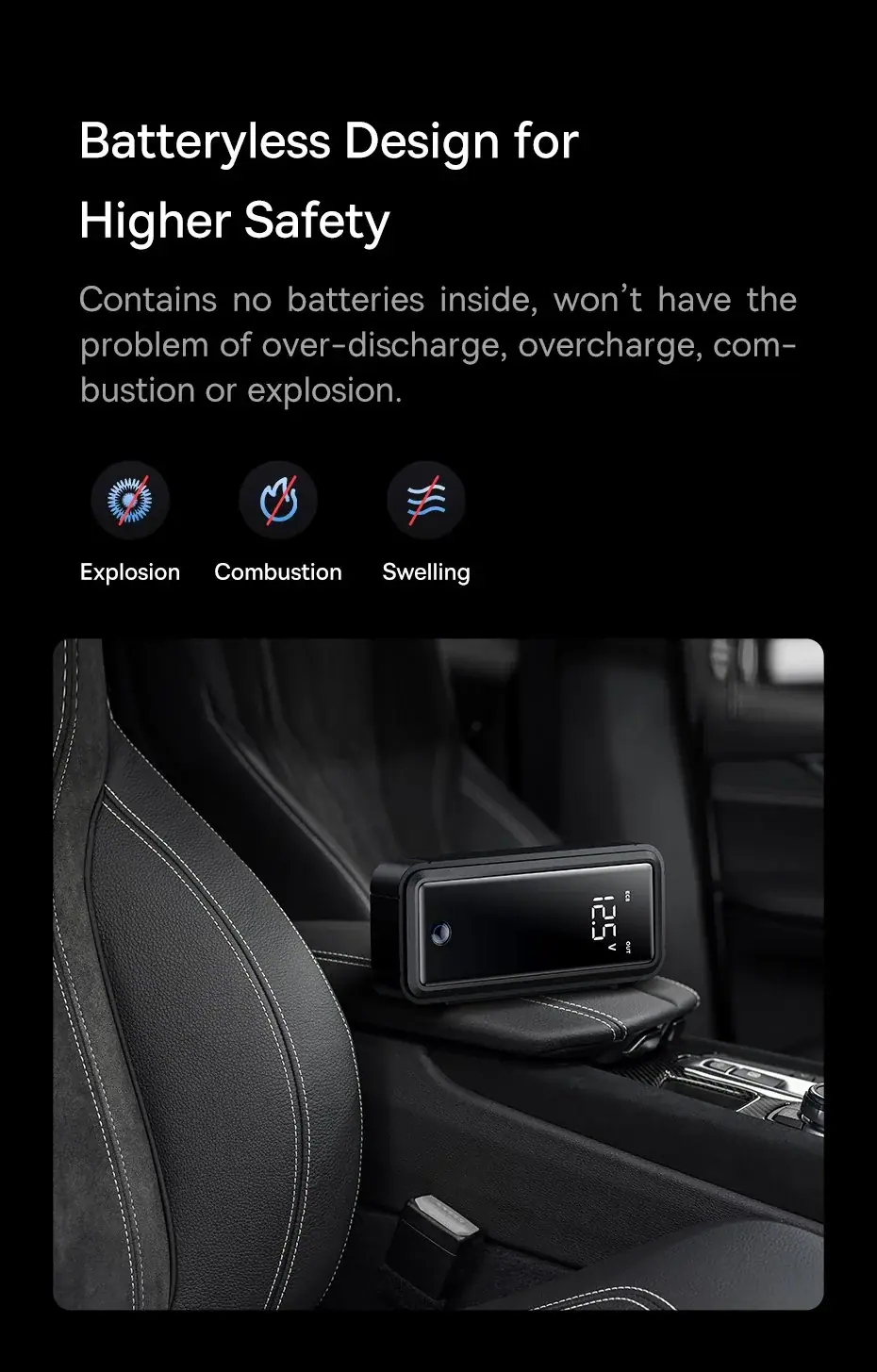 بهجای ذخیرهی انرژی، دستگاه در لحظه از باطری خودرو یا منبع DC/USB‑C