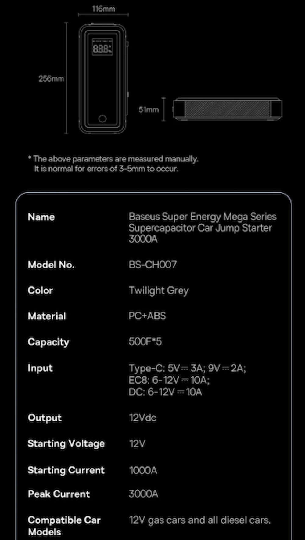 باتری داخلی عمل میکند. این مدل با جریان پیک 3000 آمپر و قابلیت شارژ کامل در 3 دقیقه، برای خودروهای 12 ولت بنزینی و دیزلی طراحی شده است.