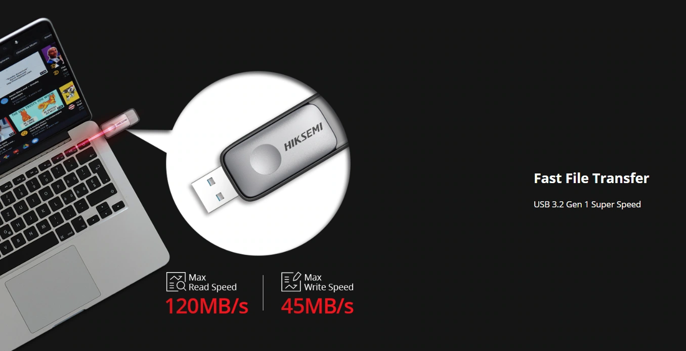 این فلش مموری از رابط USB 3.2 Gen 1 پشتیبانی می‌کند و حداکثر سرعت خواندن داده تا حدود 120 مگابایت بر ثانیه و نوشتن تا 45 مگابایت بر ثانیه را ارائه می‌دهد. سازگاری با USB 2.0 باعث می‌شود بتوان آن را در دستگاه‌های قدیمی‌تر نیز استفاده کرد. این سرعت‌ها امکان انتقال سریع فایل‌های چندگیگابایتی مانند ویدئوهای HD و پروژه‌های کاری را در زمانی کوتاه فراهم می‌سازد.