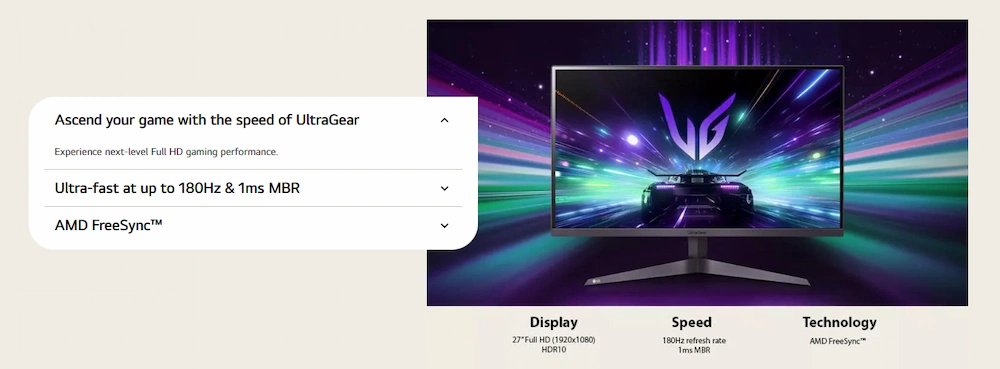 مانیتور LG 27GS50F‑B از سری UltraGear™ Gaming با رزولوشن Full HD (1920×1080) و نرخ نوسازی ۱۸۰ Hz، انتخابی ایدهآل برای گیمرهایی است که