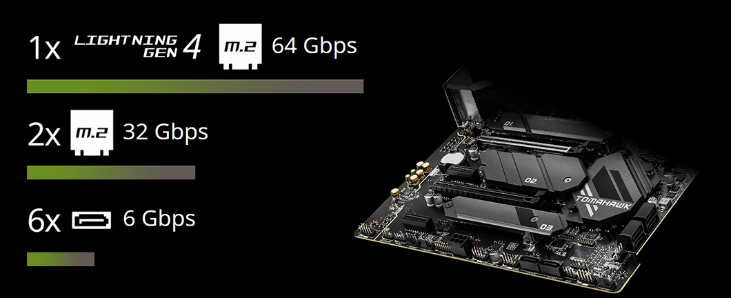 مادربردهای MSI B560 با استفاده از نسل یازدهم پردازندههای اینتل، از آخرین نسخه فناوری Lightning یعنی GEN 4 پشتیبانی میکنند که سریعترین سرعت را در بین حافظههای M.2 در اختیار کاربر قرار میدهد. تا 64 گیگابایت بر ثانیه!