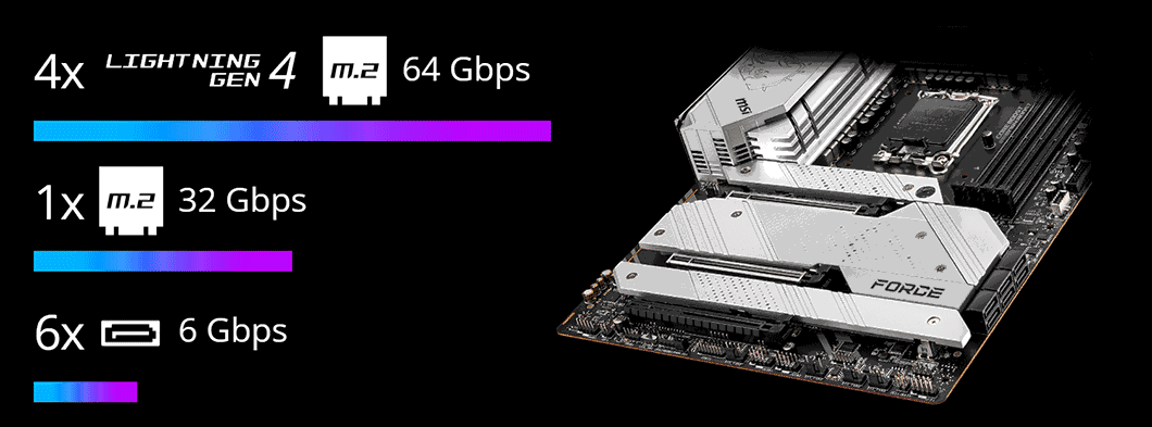 مادربردهای MSI Z690 با استفاده از نسل دوازدهم پردازندههای اینتل، از فناوری Lightning نسل 4 پشتیبانی میکنند که سریعترین سرعت را در بین حافظههای M.2 در اختیار کاربر قرار میدهد. تا 64 گیگابایت بر ثانیه!